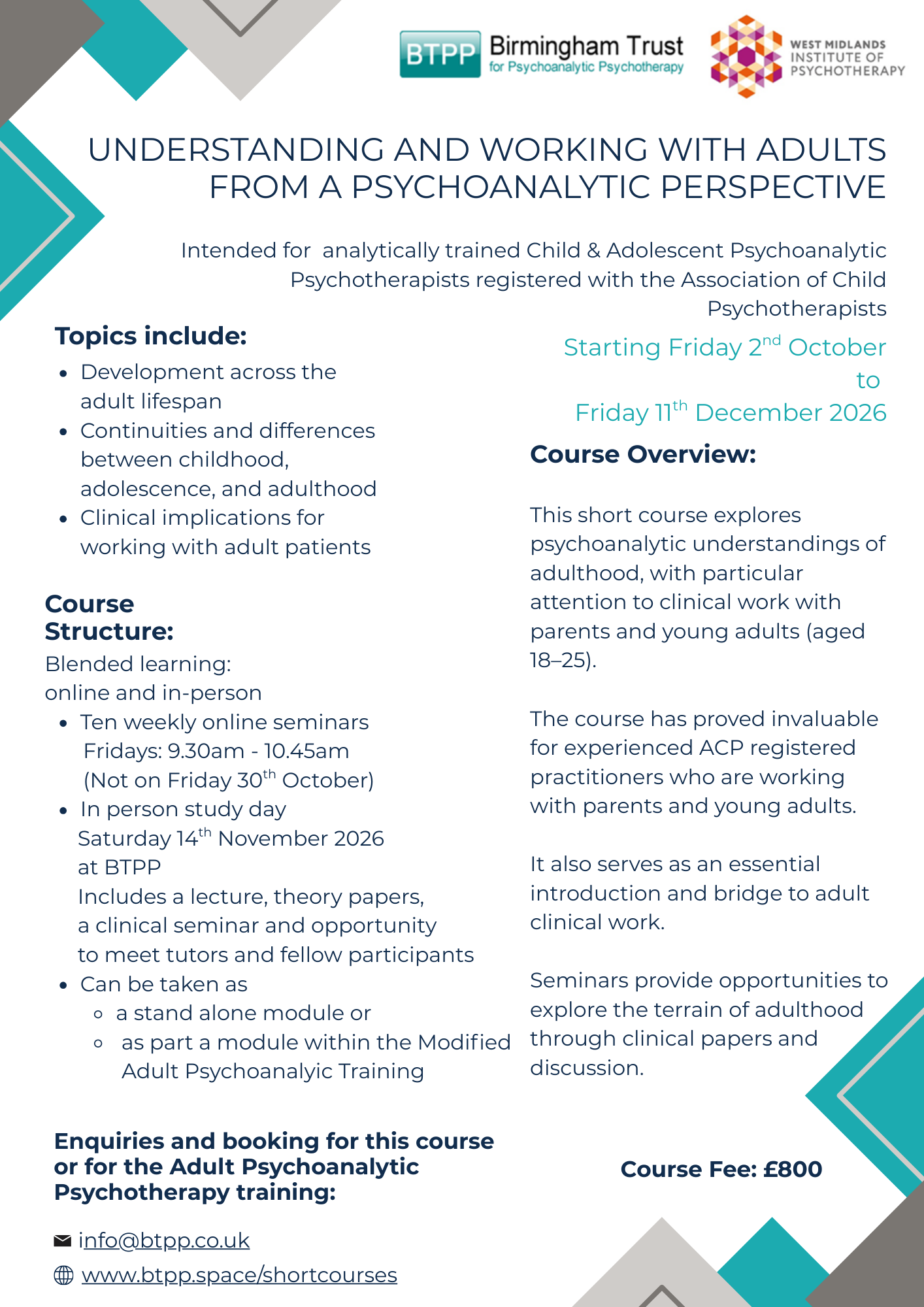 For further information on the course please email info@btpp.co.uk.